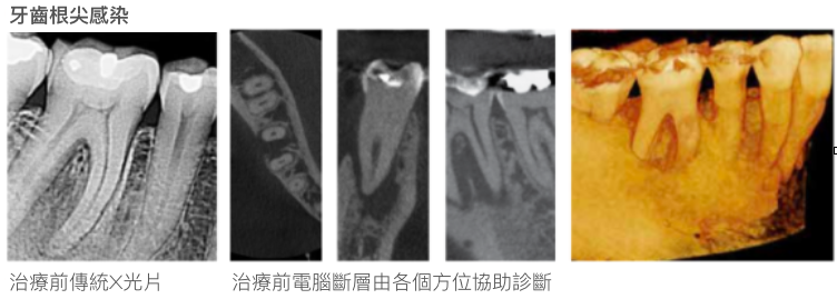 牙科錐狀電腦斷層相比於傳統的X光片,能在最小的輻射暴露中提供牙醫師3D立體結構的評估,如牙齒根管、骨頭、上顎竇等。
