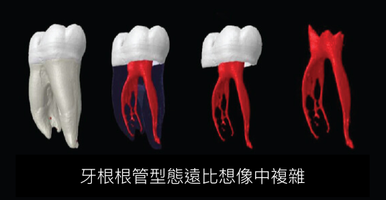 在您想像中的根管,可能就如同牙根的型態般單純,但其實根管就如同地底下的牙根班錯綜複雜,一旦遭受感染,除了之前提過的“電腦斷層”、“顯微鏡”,輔助診斷治療外,更重要的是牙科醫師的徹底的清創和沖洗。